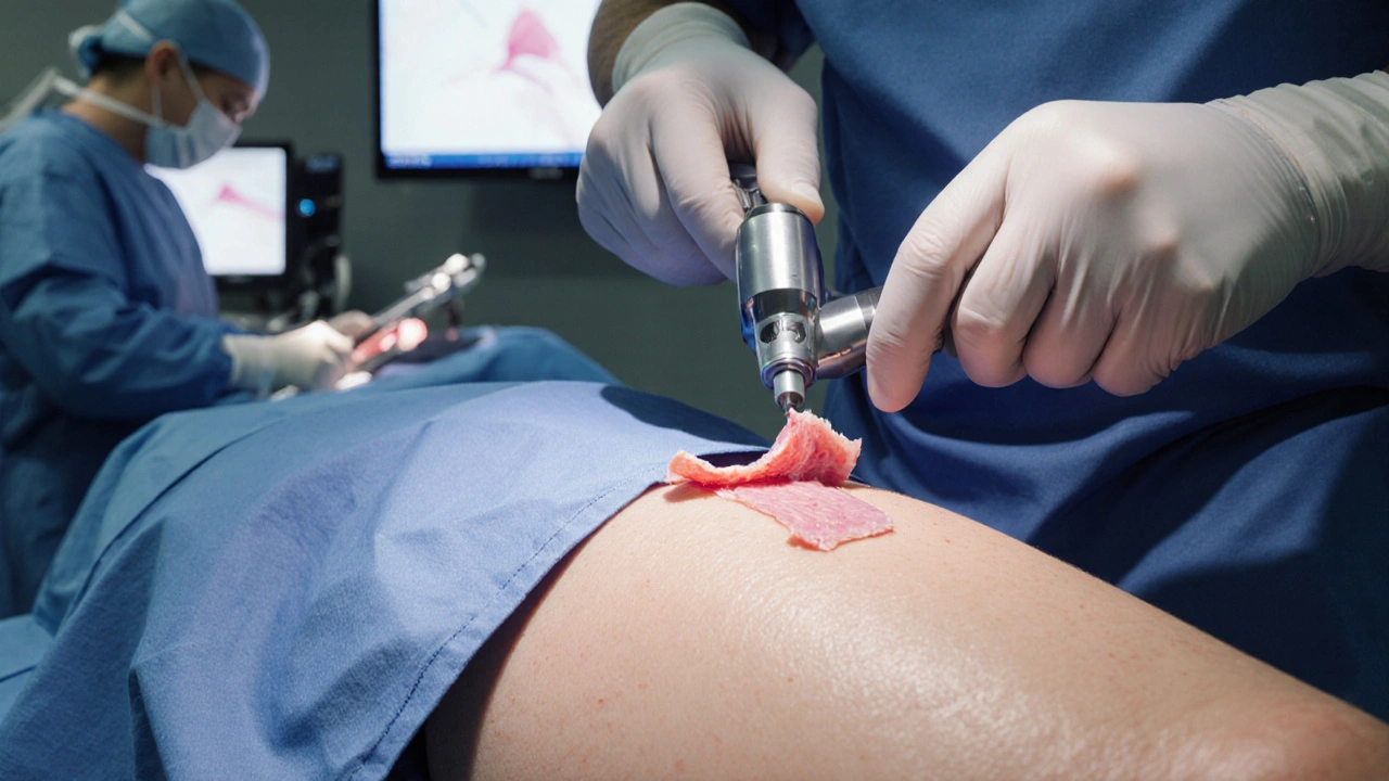 - Prélèvement du tissu donneur : À l’aide d’un dermatome instrument motorisé qui coupe la peau à une épaisseur précise, le chirurgien récupère le fragment souhaité. Le contrôle de l’épaisseur (0,2mm à 0,4mm pour une split‑thickness) influence la prise et la cicatrisation.