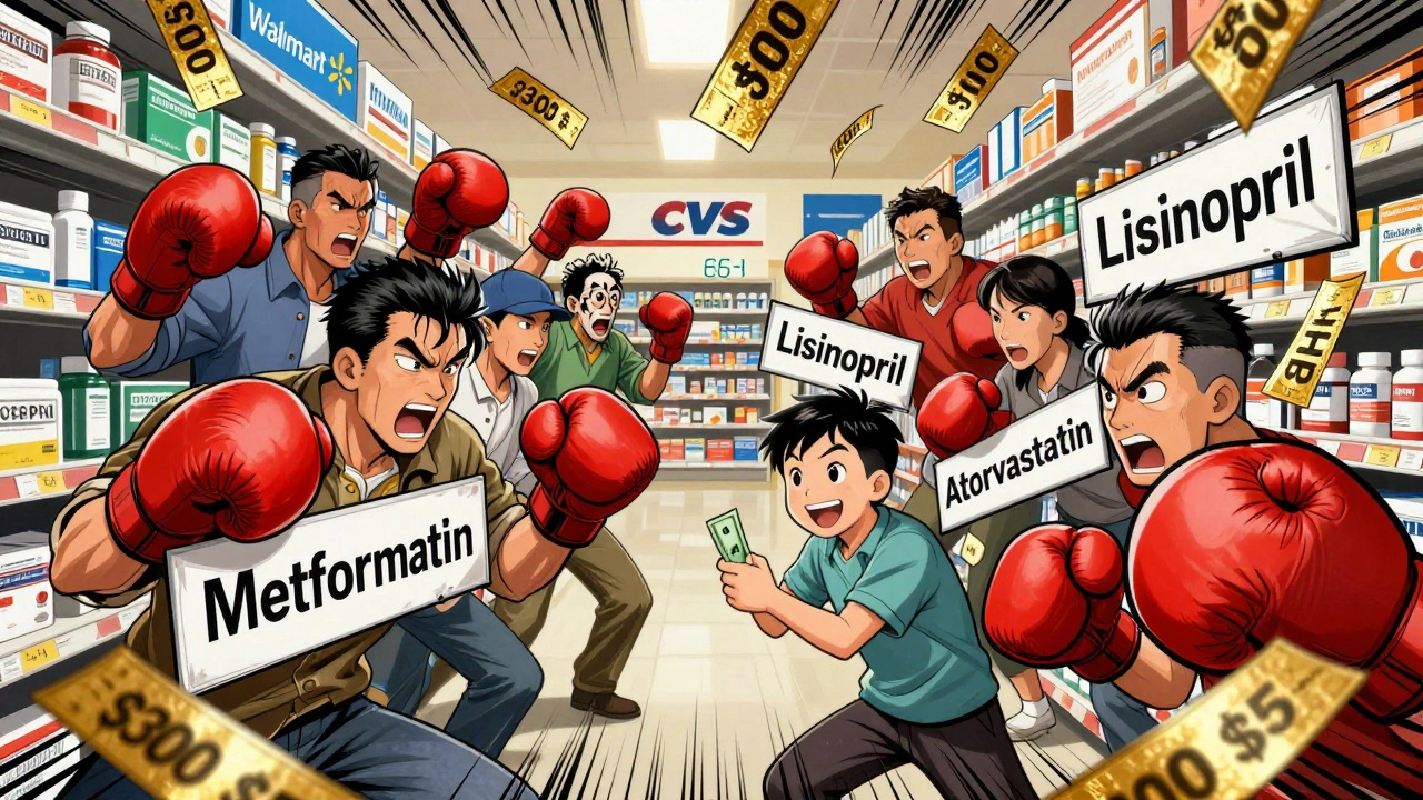 Quand un médicament de marque perd son brevet, n’importe quel laboratoire peut le copier. Pas besoin de refaire des essais cliniques coûteux. Il suffit de prouver que la version générique est aussi efficace. Dès qu’un deuxième fabricant arrive, les prix commencent à chuter. Avec trois ou quatre concurrents, la réduction peut atteindre 80 %. Et quand il y en a six ou plus ? Les prix tombent de plus de 95 % par rapport à la marque originale.
