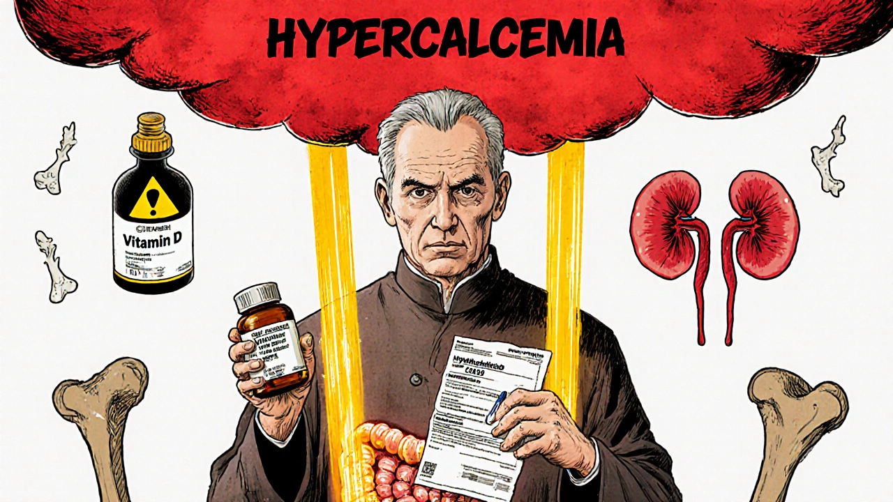 L’hypercalcémie, c’est quand votre taux de calcium dans le sang dépasse 10,5 mg/dL. En dessous, vous ne ressentez rien. Au-delà, les symptômes arrivent : fatigue intense, nausées, constipation, soif excessive, urination fréquente, et parfois confusion ou troubles du rythme cardiaque. Dans les cas graves, cela peut mener à des calculs rénaux, une insuffisance rénale, ou même des arythmies potentiellement mortelles. Les études montrent que ce risque monte en flèche quand on prend plus de 4 000 UI de vitamine D par jour. Un dosage que beaucoup de gens prennent « pour être sûrs » - souvent sans avis médical. Sur Reddit, des patients racontent avoir été hospitalisés après avoir pris 5 000 UI de vitamine D3 en complément de leur hydrochlorothiazide. Une infirmière a même écrit : « J’ai eu 3 patients en 6 mois avec un calcium à 11 mg/dL juste à cause de cette combinaison. »Qui est le plus concerné ?